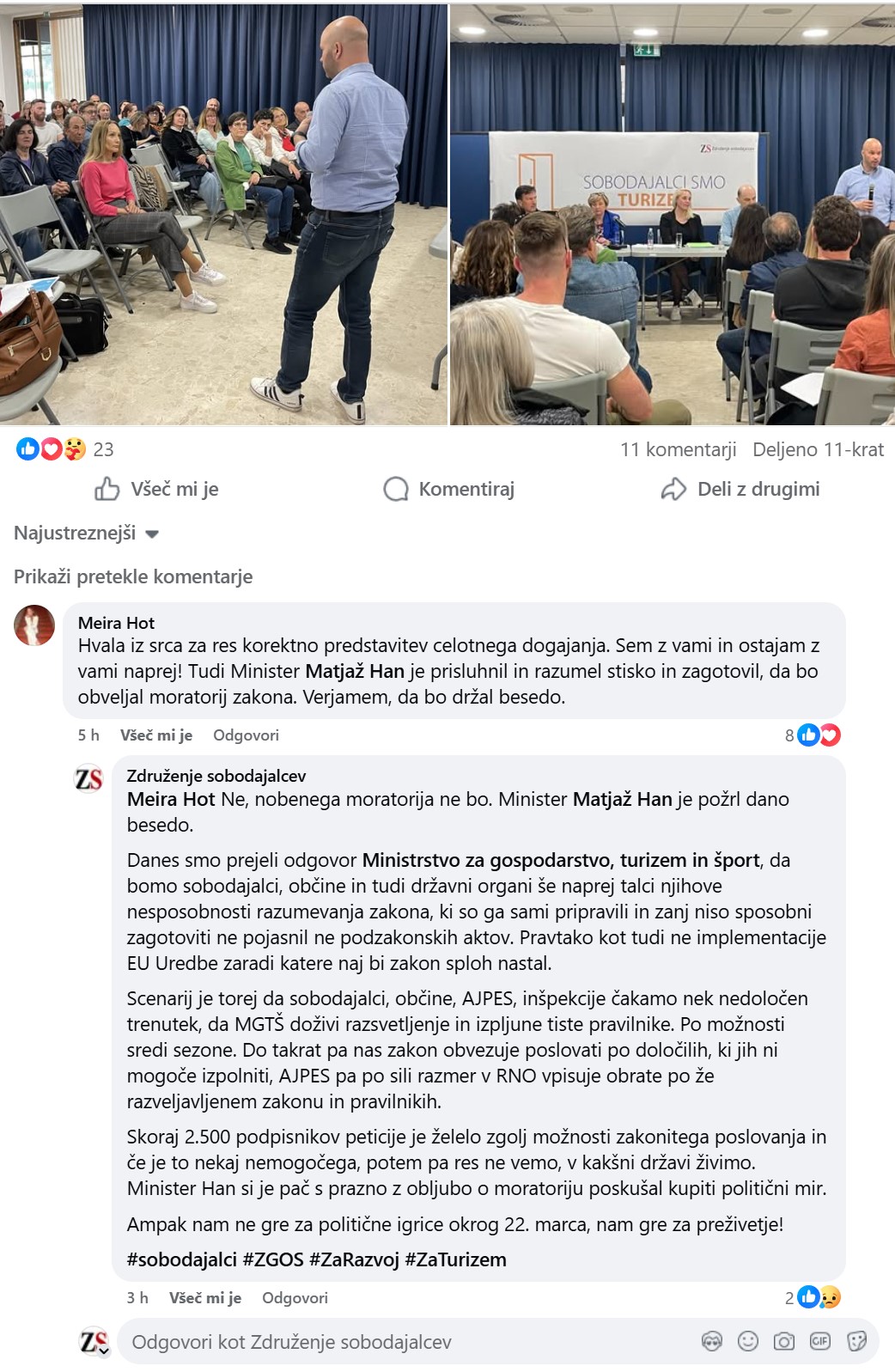 Po tem, ko smo ministru za gospodarstvo in turizem Matjažu Han minuli teden predali peticijo s skoraj 2.500 podpisi in prejeli obljubo o moratoriju na novelo Zakona o gostinstvu, je danes sledil hladen tuš v uradnem dopisu ministrstva, ki to možnost zavrača. V združenju nad tem niti nismo kaj prida presenečeni, saj smo bili z ministrstva takšnih lažnih obljub deležni cel mandat, pa vendar je tokrat prvič šlo neposredno za obljubo ministra in smo si vseeno nadejali, da  bi lahko bilo kaj drugače.